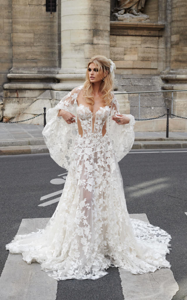 A sensual and daring A-line corseted gown featuring floral lace, deep plunge front, and show-some-skin sheer cutouts. This gown perfectly encapsulates the bridal wow factor every bride dreams of, achieving a gorgeous silhouette and unique style through its ethereal design. Pair with the cathedral-length Sandy veil and shawl-style.