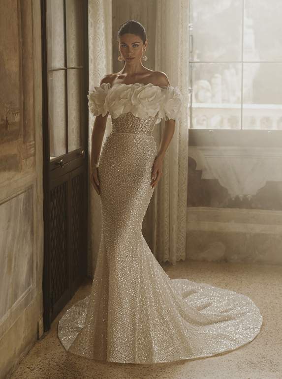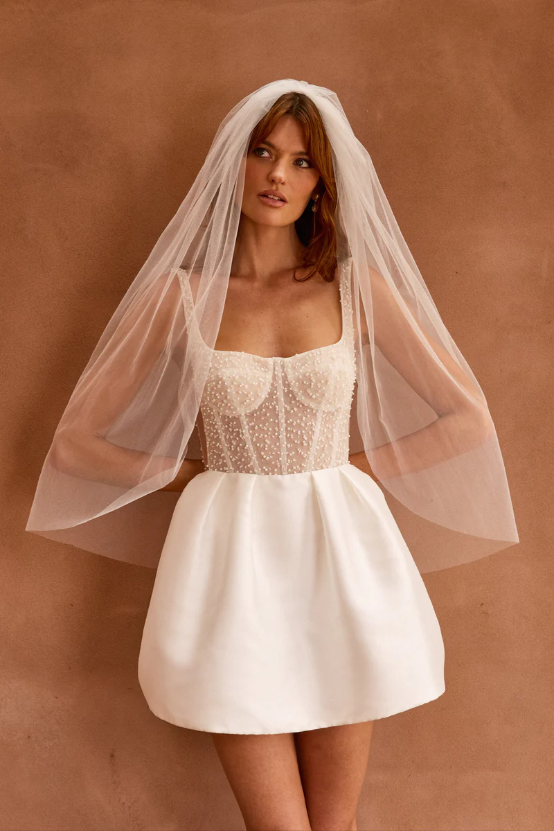Poppy perfectly encapsulates fun, youthfulness, opulence and modernity in the form of her sheer, pearlescent beaded, corset-like bodice and Mikado mini skirt lined to the zip with playful buttons.