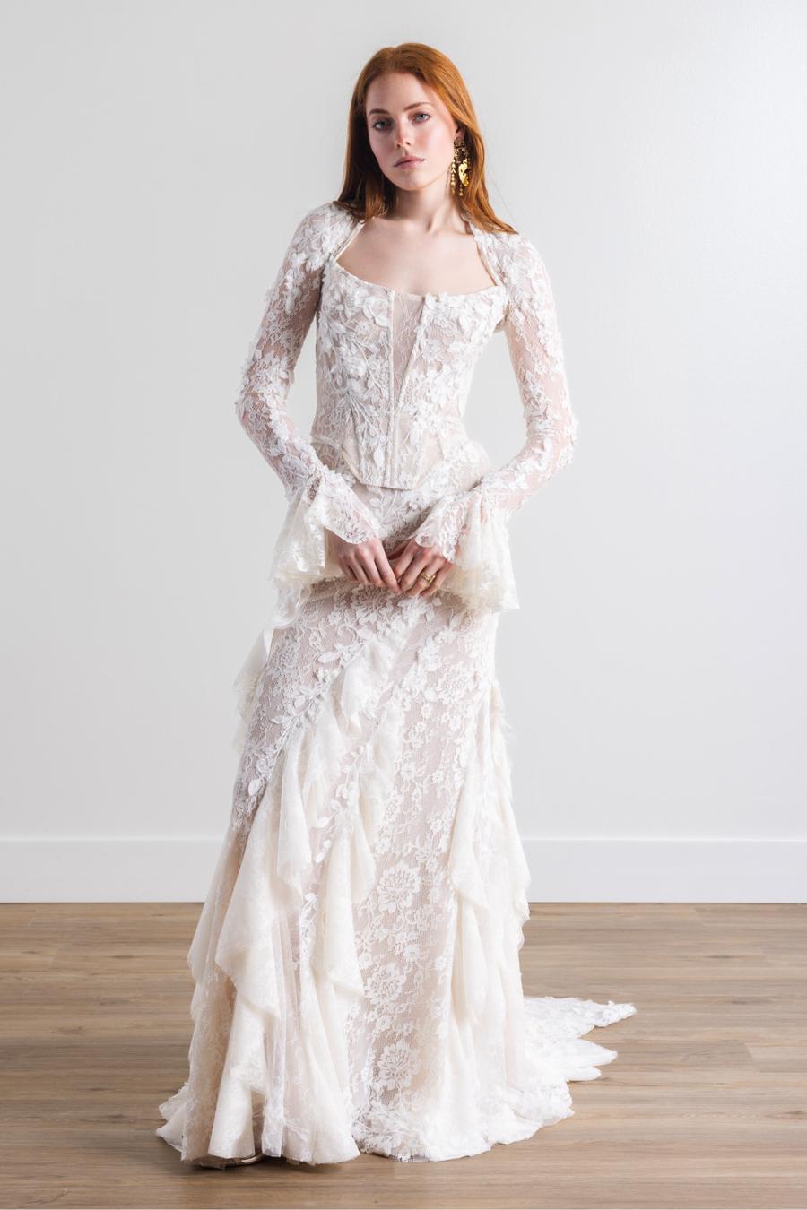 A long sleeve fitted gown made of our Floral Flutter Motifs, Mika Lace, and Sweet Paisley Chantilly Lace. Echo features a corset bodice and flutter sleeve, to add dreamy delicate details.