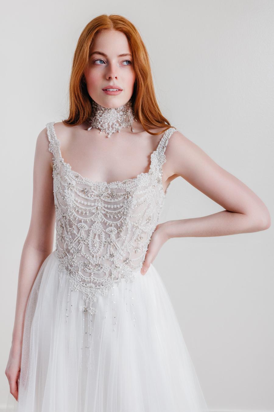 With a flowing A-line silhouette, Marlowe stands as a testament to ethereal design. Distinguished by its optional choker and corset bodice, adding unique appeal.
