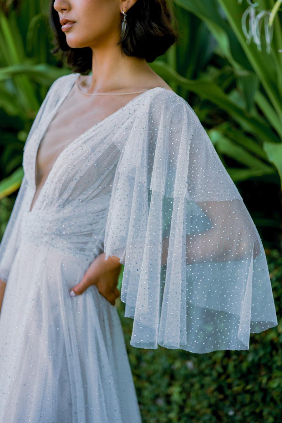A celestial masterpiece crafted to captivate hearts. Created from a blend of Galaxy Rhinestone Tulle, Illusion Tulle, and Haze Net, this gown is a symphony of ethereal textures and luminous sparkle.