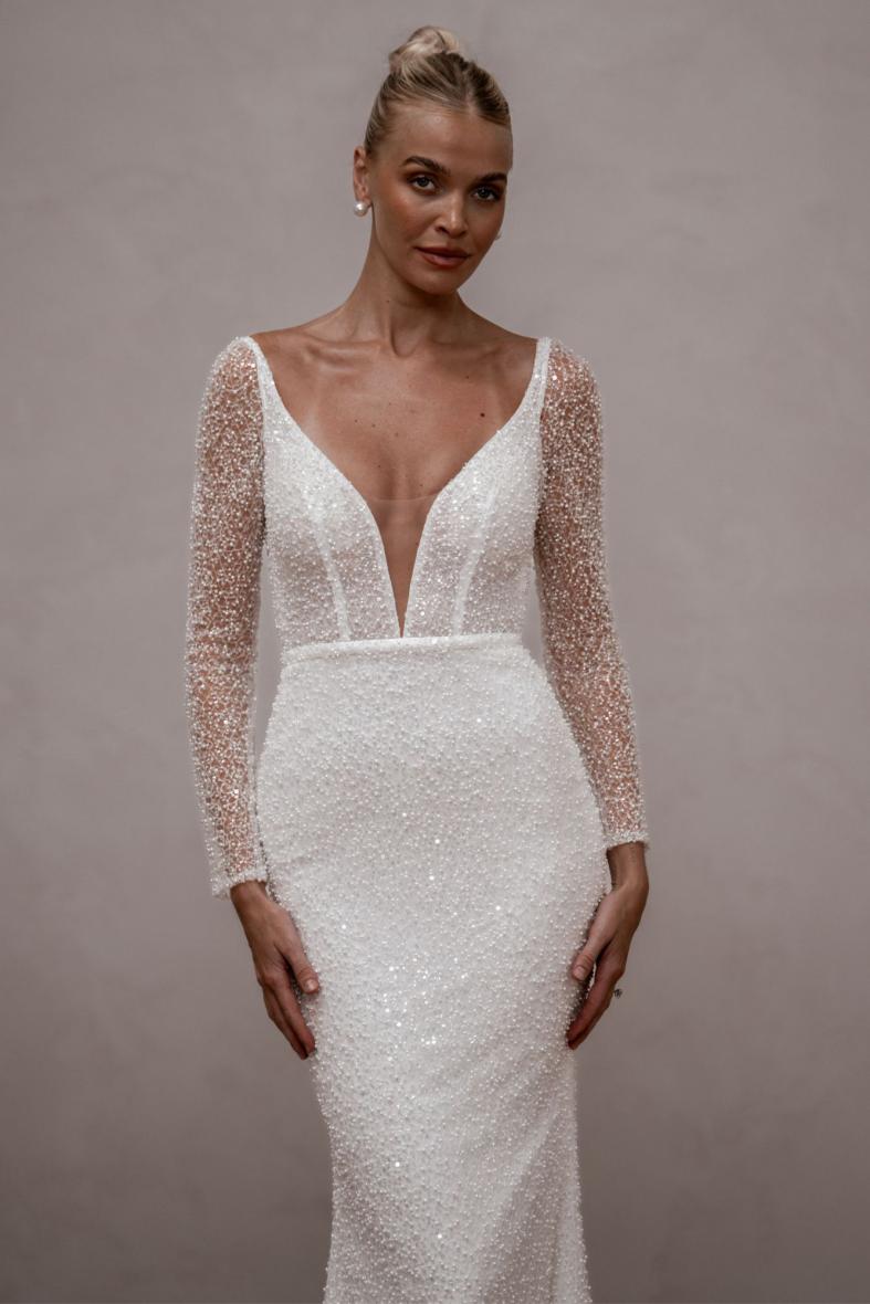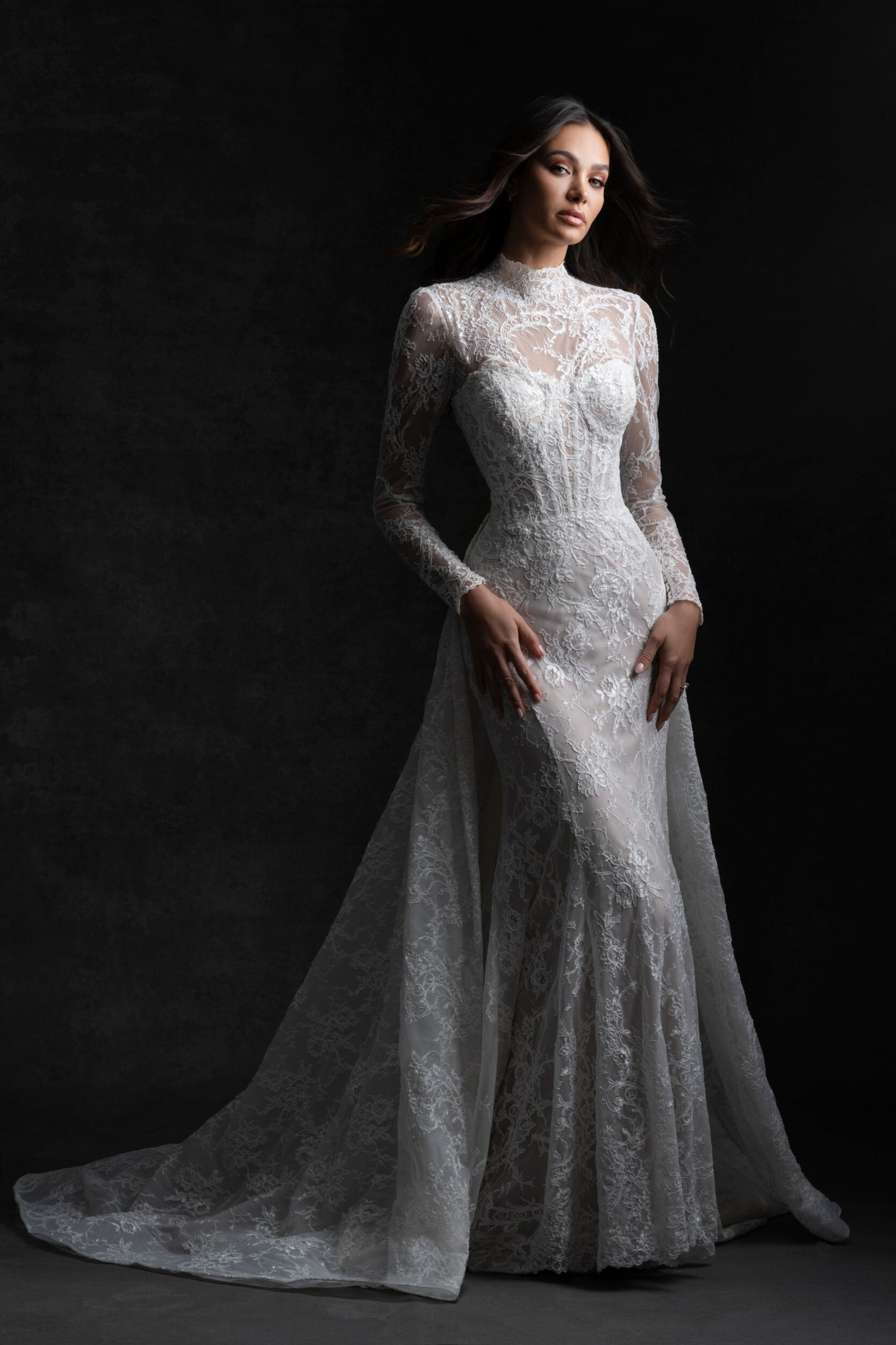 Modern gowns featuring long sleeves allow the bride to keep the arms covered while giving the option to be daring in other ways. Below you will see high slits, plunging necklines, low backs, and more! Which style speaks to you?