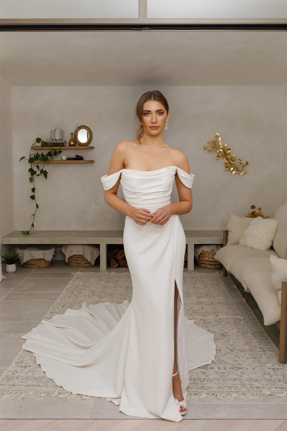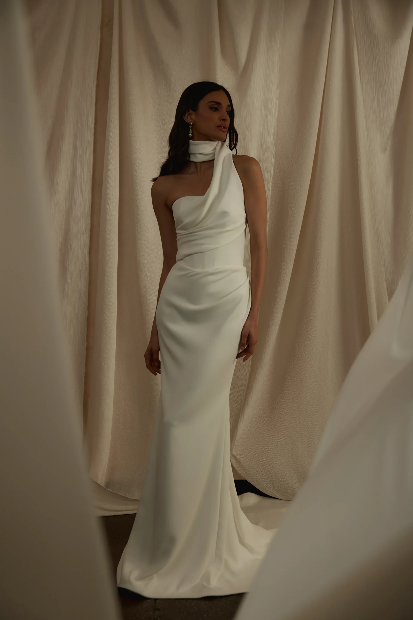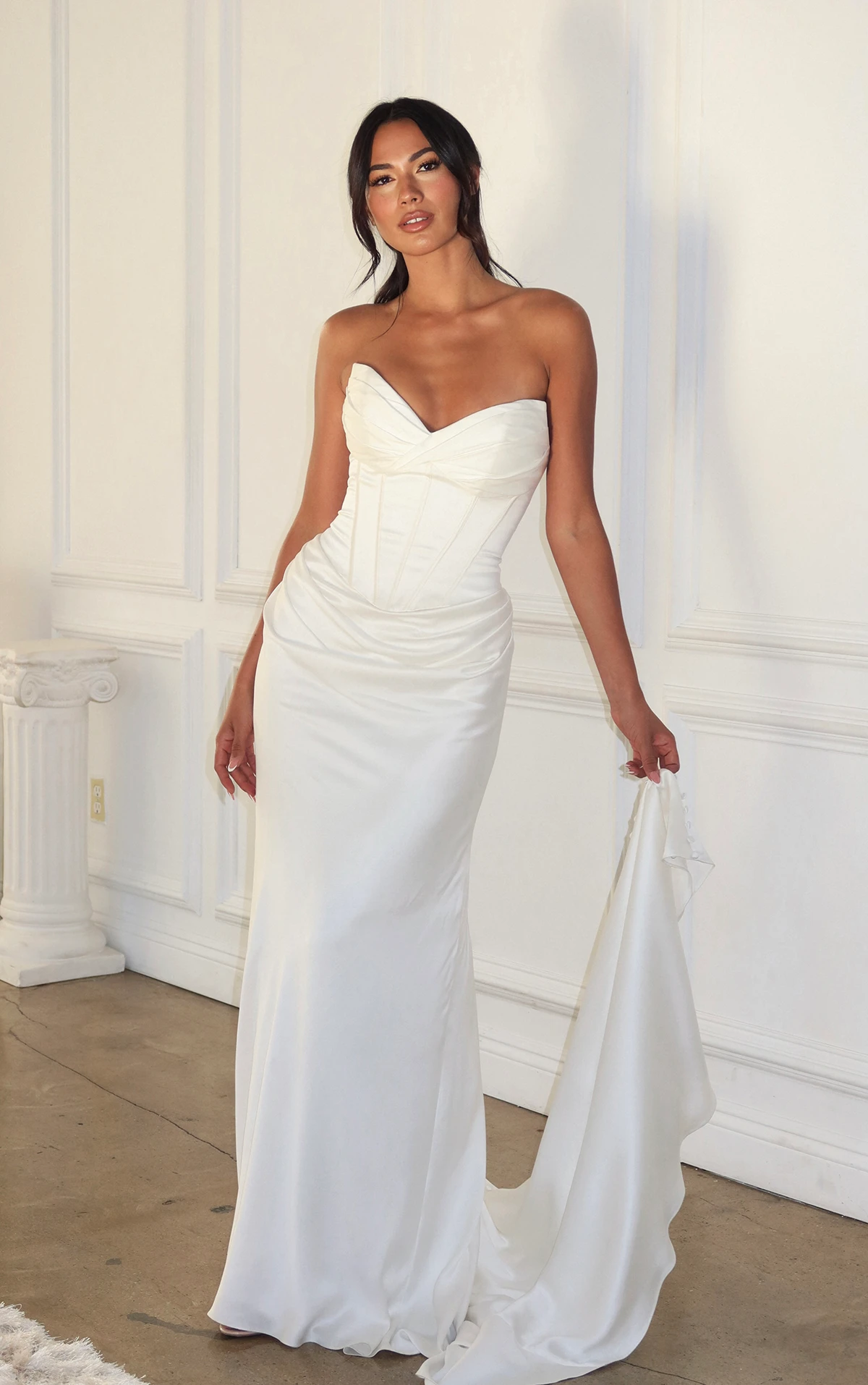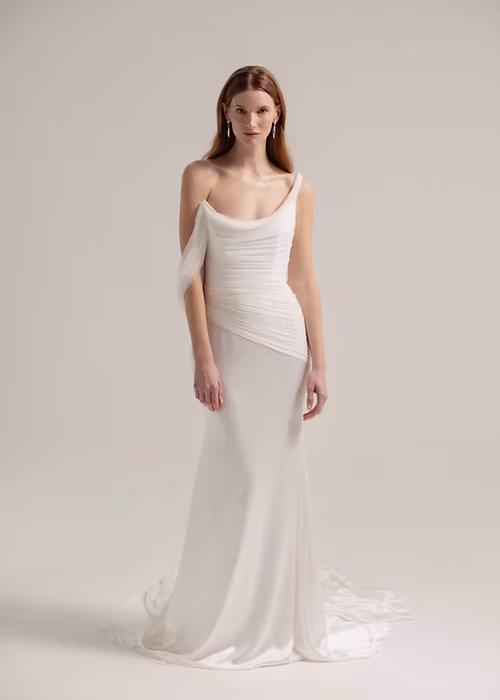 Sheath wedding gowns, also known as column or slip dresses, are the epitome of understated elegance and perfect for the bride who wants to show off those fabulous curves. Sheath gowns hug your body and feature a narrow and straighter shape from top to bottom. The sleek, straight cut accentuates your waistline as well as elongate the body.