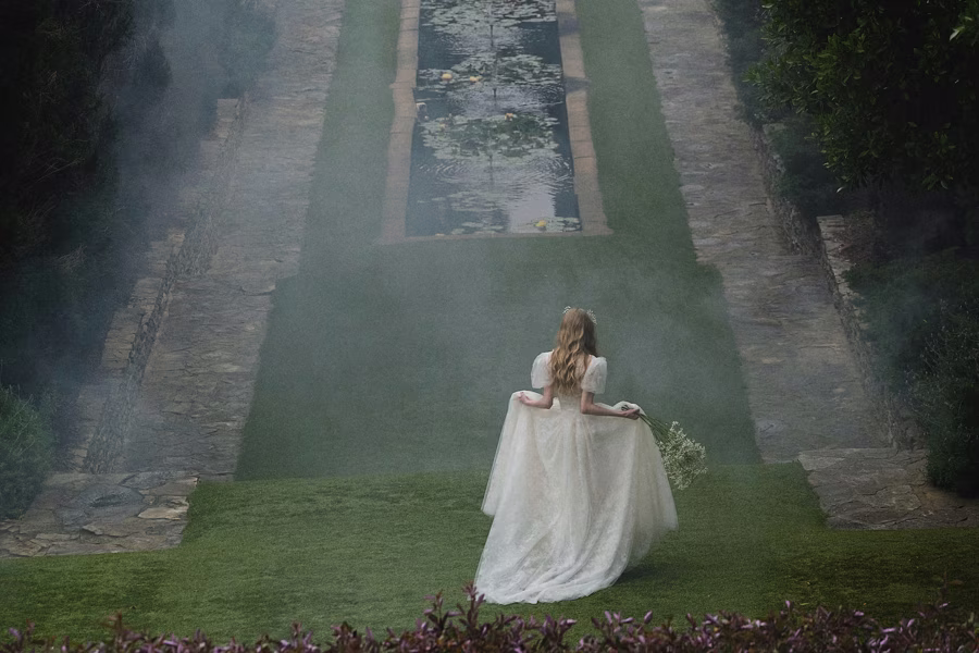 Gowns inspired by Wuthering Heights draw on the windswept and dramatic setting of the Yorkshire moors and the timeless love between Catherine and Heathcliff. These