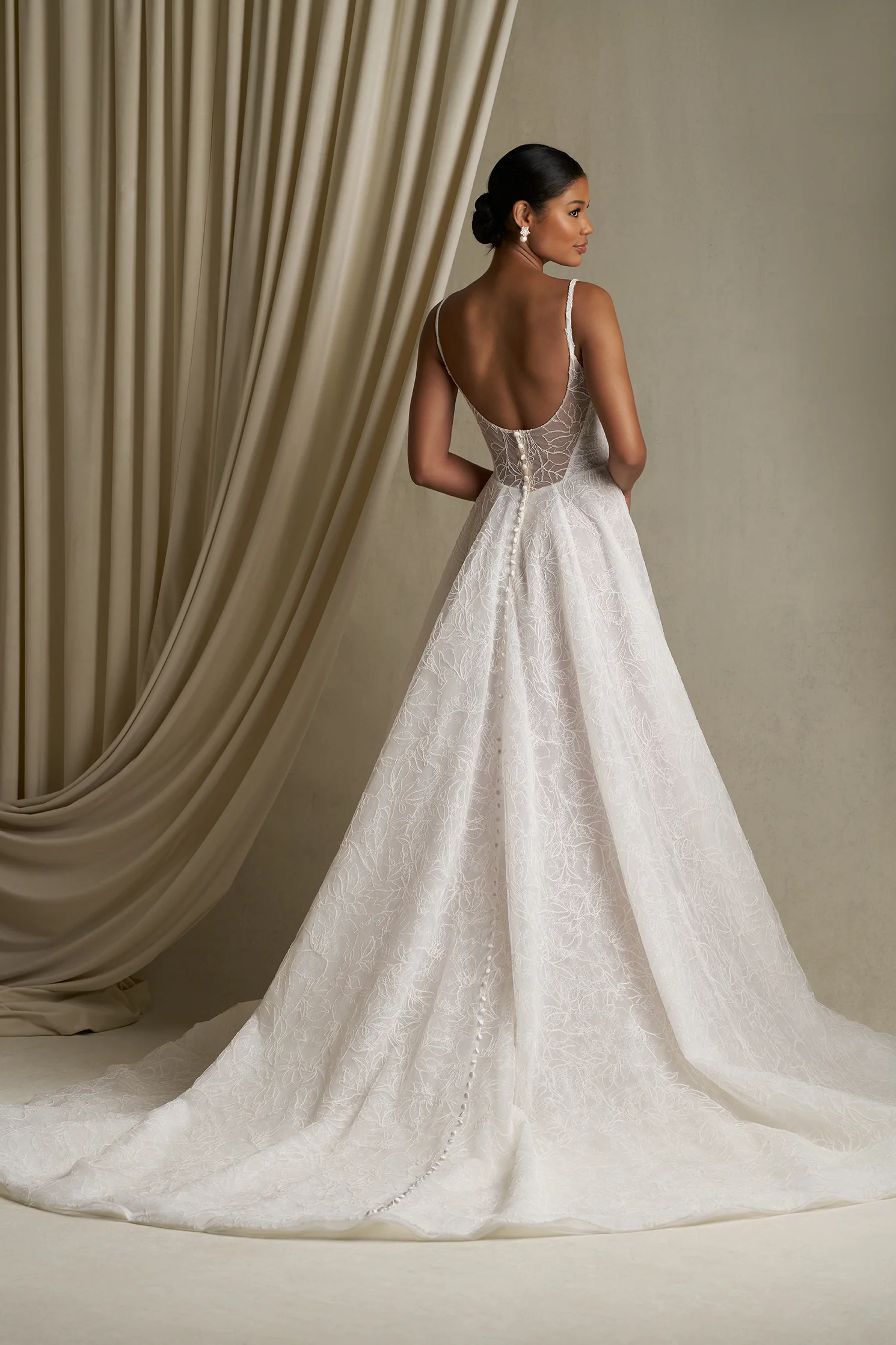 Delicately structured yet effortlessly soft, this A-line gown features corded lace layered over Chantilly lace for a dimensional, romantic finish. The square neckline and slender spaghetti straps create a modern balance to the gown’s classic lacework, while the natural waist and flowing skirt evoke ease and movement.