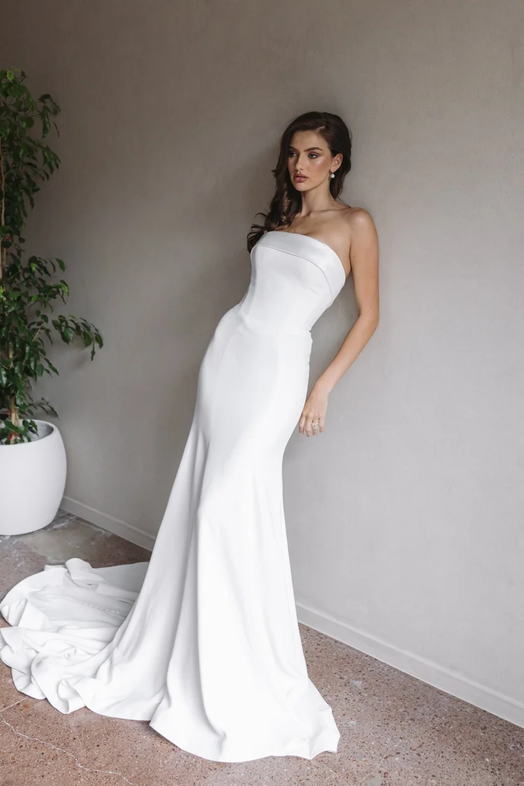 An elegant but sexy style with her beaded sheer bodice and french crepe fitted skirt. She fits firmly over the hips and bum to reveal a womanly figure and showcases a stunning V neck and a plunging low V back.