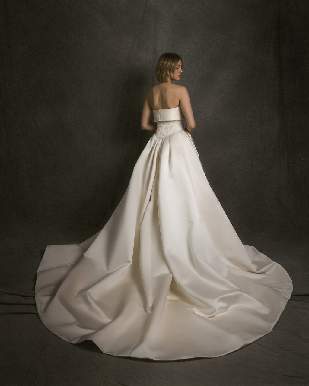 Modern structure meets timeless artistry in this striking gown, crafted from rich double-face satin for a luminous, sculptural finish. The clean strapless neckline is complemented by a dramatic draped overlay that adds dimension and softness. A dropped waist transitions into a pleated skirt, creating an effortlessly regal silhouette. Delicate French knot embroidery forms subtle botanical motifs across the bodice, gracefully cascading onto the draped overlay for a seamless, organic flow of texture. A refined choice for the bride drawn to architectural elegance and heirloom craftsmanship.