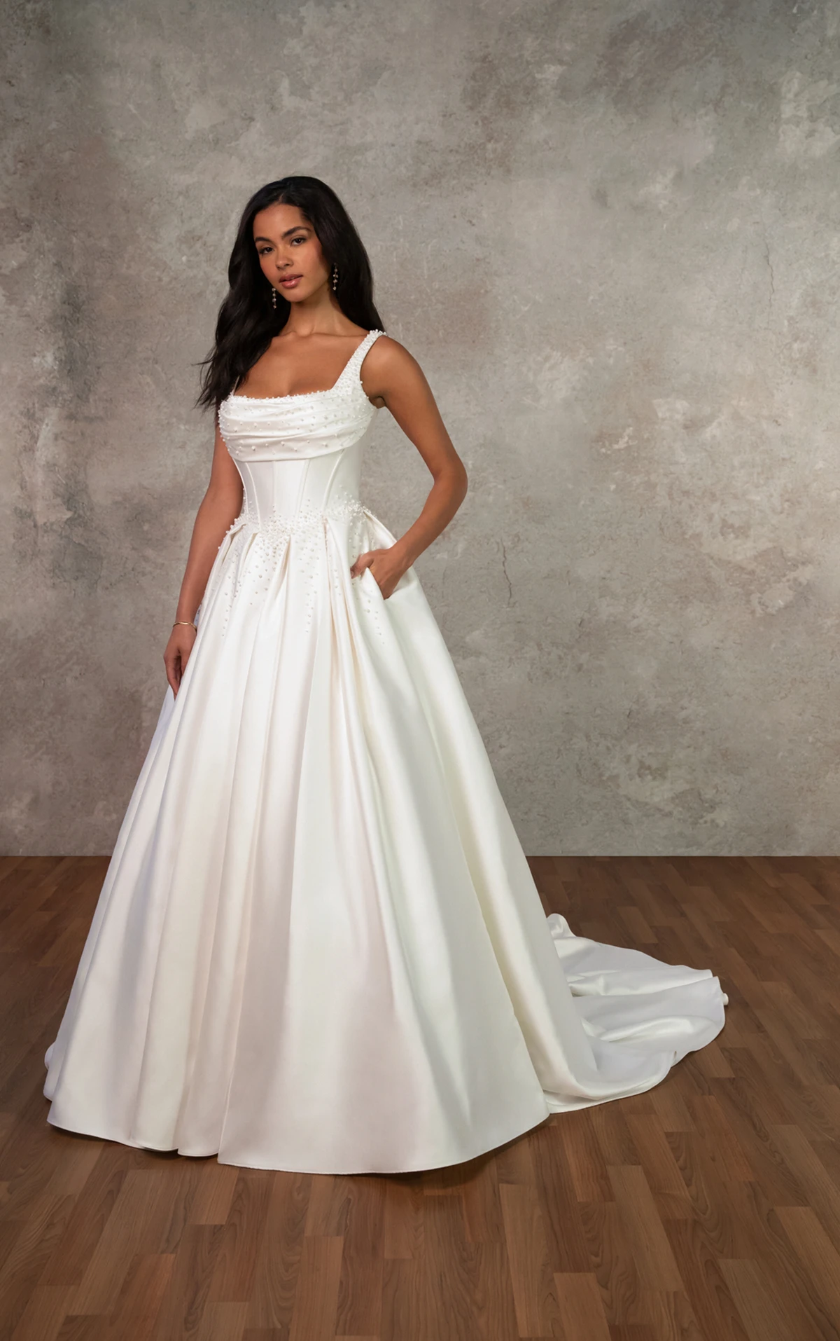Wedding gown sizes are determined based on your bust, waist and hip measurements. Each designer fits differently and has its own size chart. Our stylists will help determine the best size.