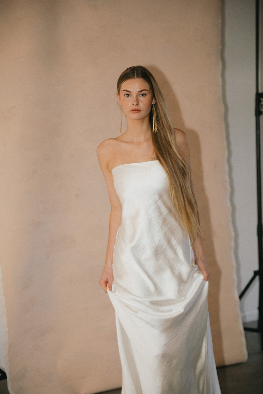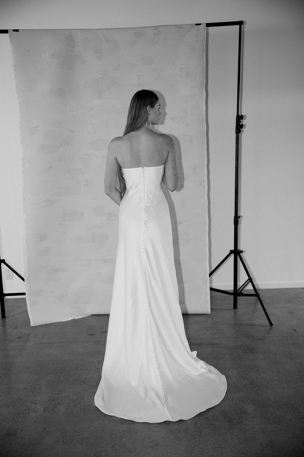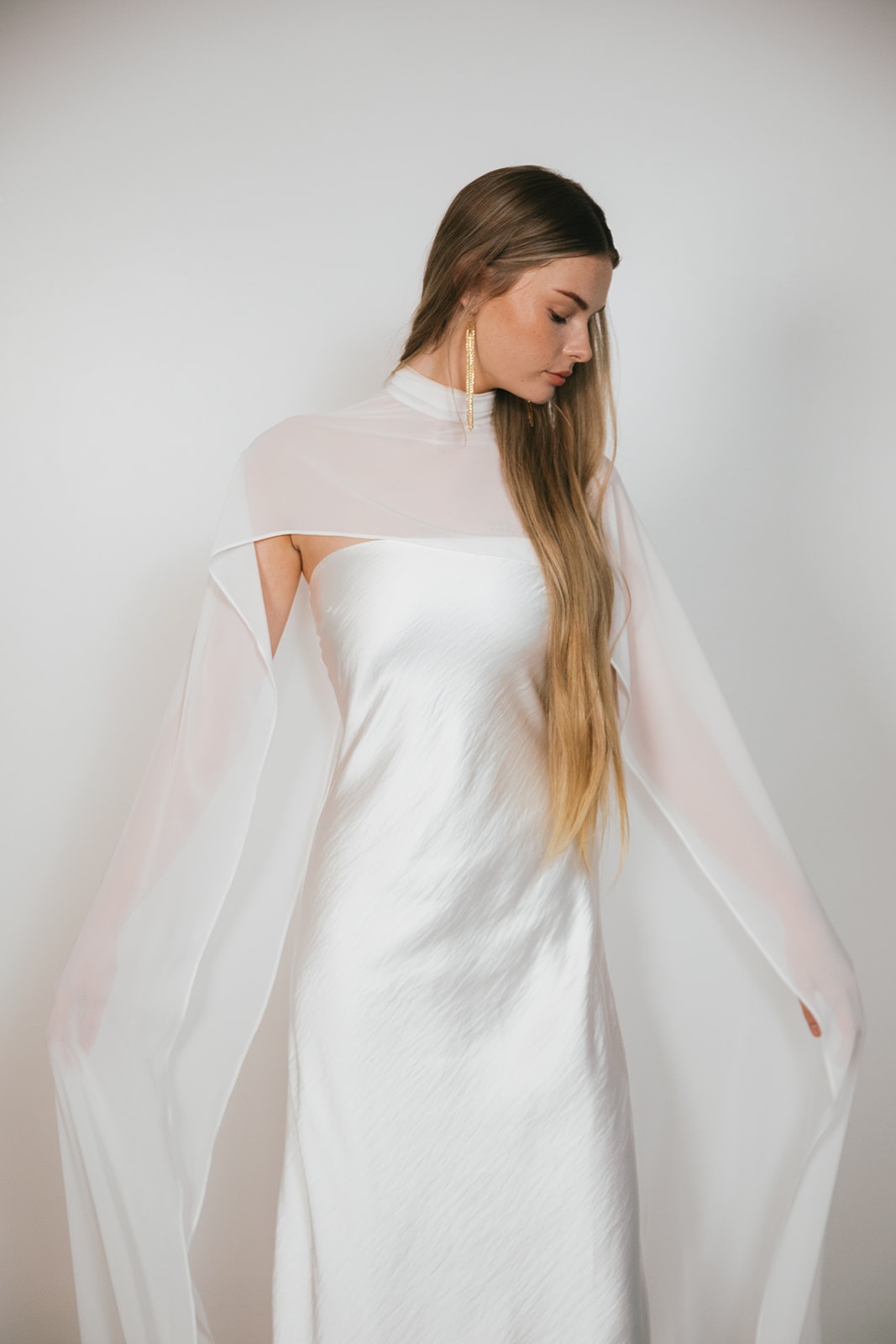 Distilled modern minimalism, softened with ethereal drama. Crafted from liquid satin, her sheen catches light like water in motion under sunlight. The strapless column bodice sits with quiet precision, elongating the figure in pure uninterrupted lines. Draped over the shoulders, a sheer chiffon mantle finishes this duet.