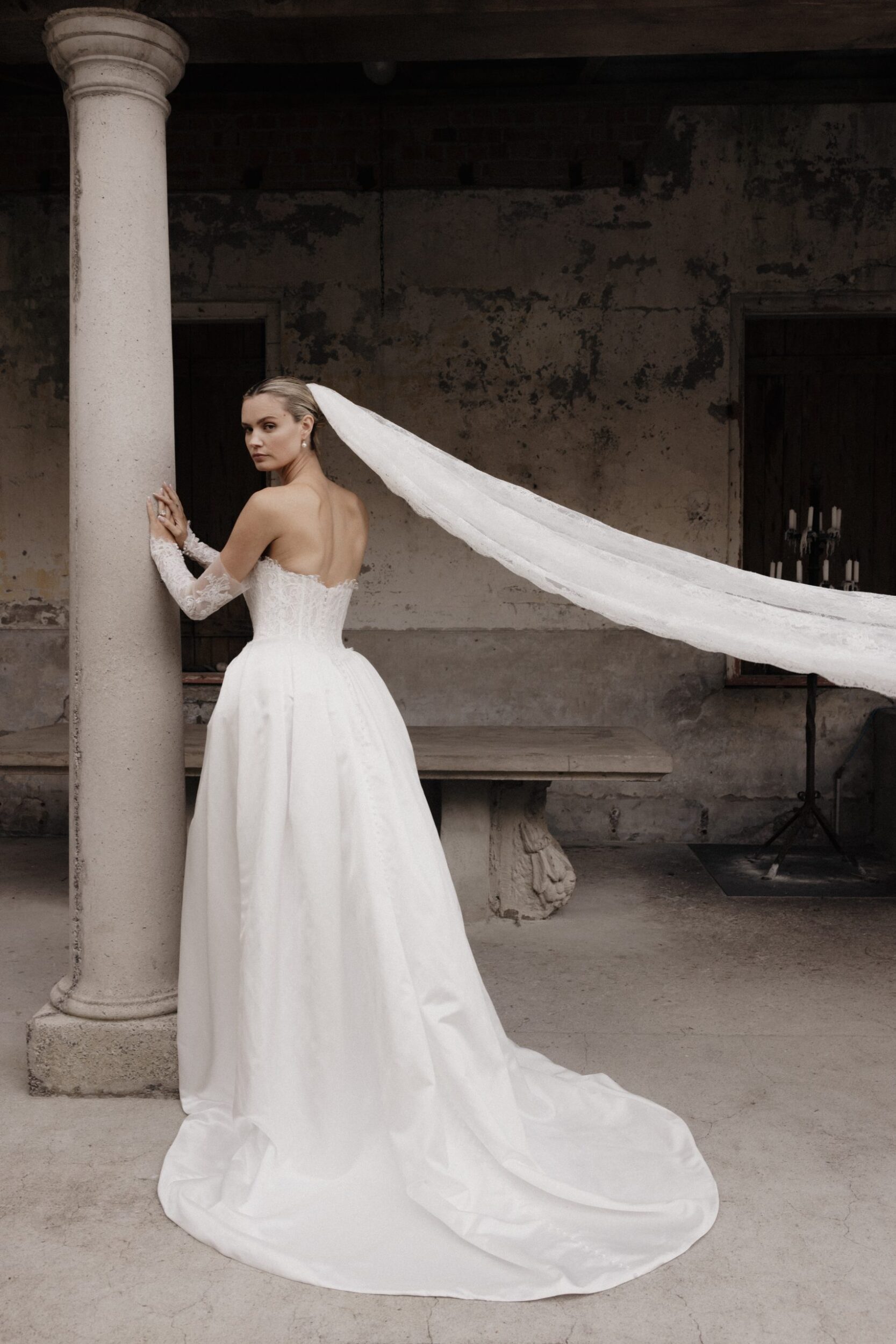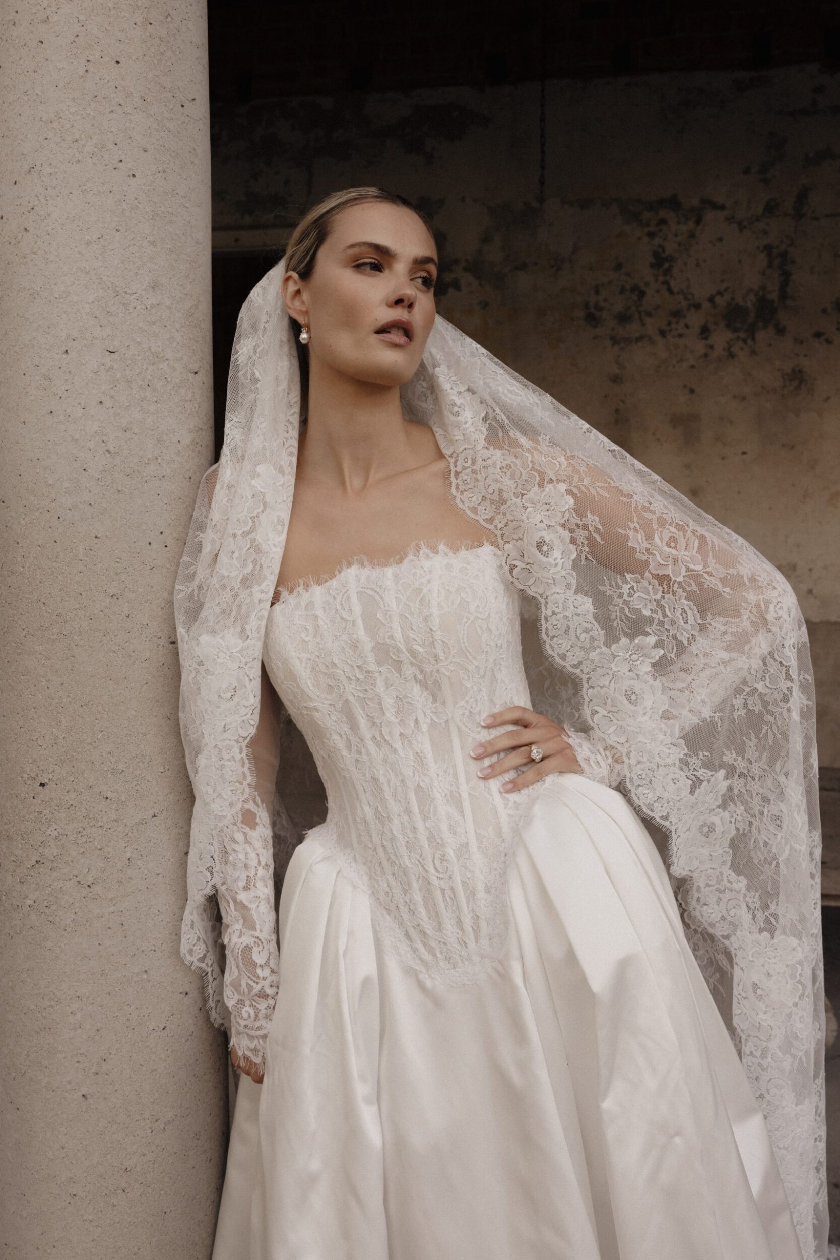 A gown that breathes grandeur, like history rewritten in lace and satin.  Lucienne’s corseted Guipure lace bodice with architectural boning flows into a voluminous royal satin skirt that glimmers.