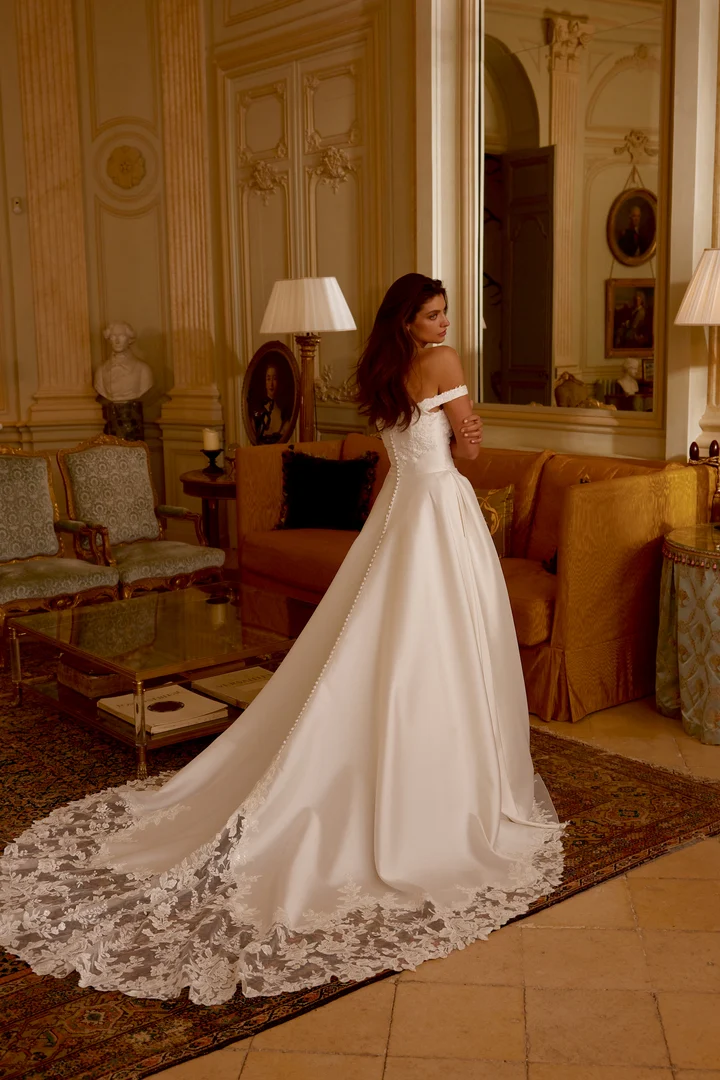 Mikado A-Line Gown with Sequined Lace and Dramatic Cathedral Train.