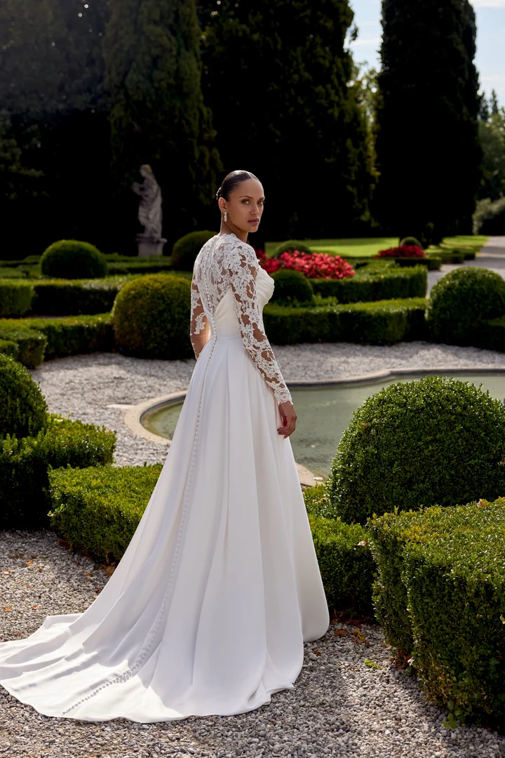 Charmeuse A-line gown with corded Alencon lace Queen Anne neckline. Corded lace long sleeves finished with buttons at wrist. Features corded lace peek-a-boo sweetheart beneath draped charmeuse neckline. Bodice includes corset structure. Draping continues onto back neckline below an illusion lace back. Complete with buttons from back neckline to end of chapel length train.