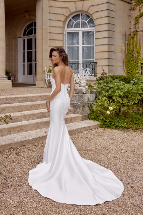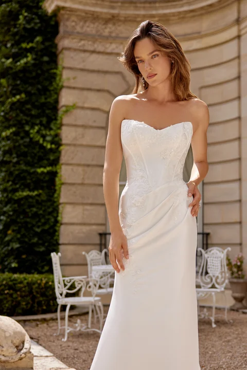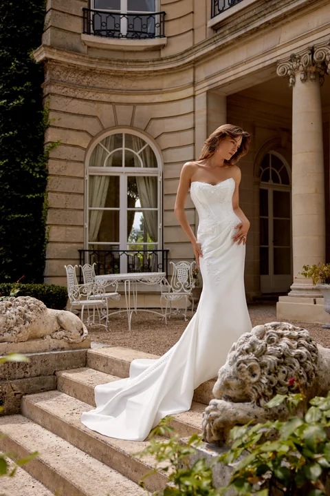 Stretch Mikado fit and flare gown with strapless pointed sweetheart neckline. Fully lined bodice features exposed corset boning that leads to a Basque waistline. Sequined and beaded lace appliques adorn the bodice and trickle onto the skirt which features asymmetrical draping across the hip. 3D floral appliques are scattered throughout bodice and skirt. Finished with buttons down the chapel length train.