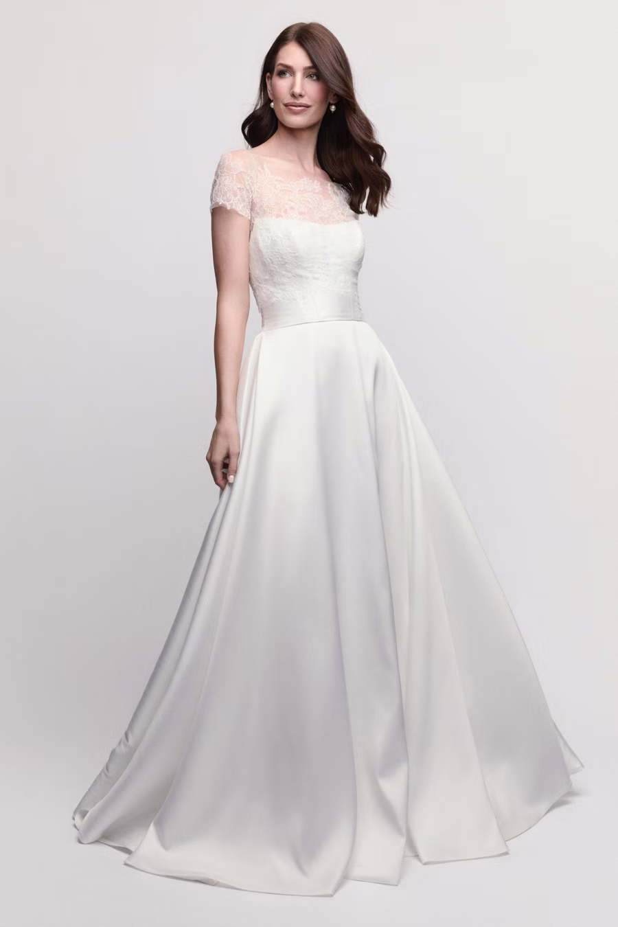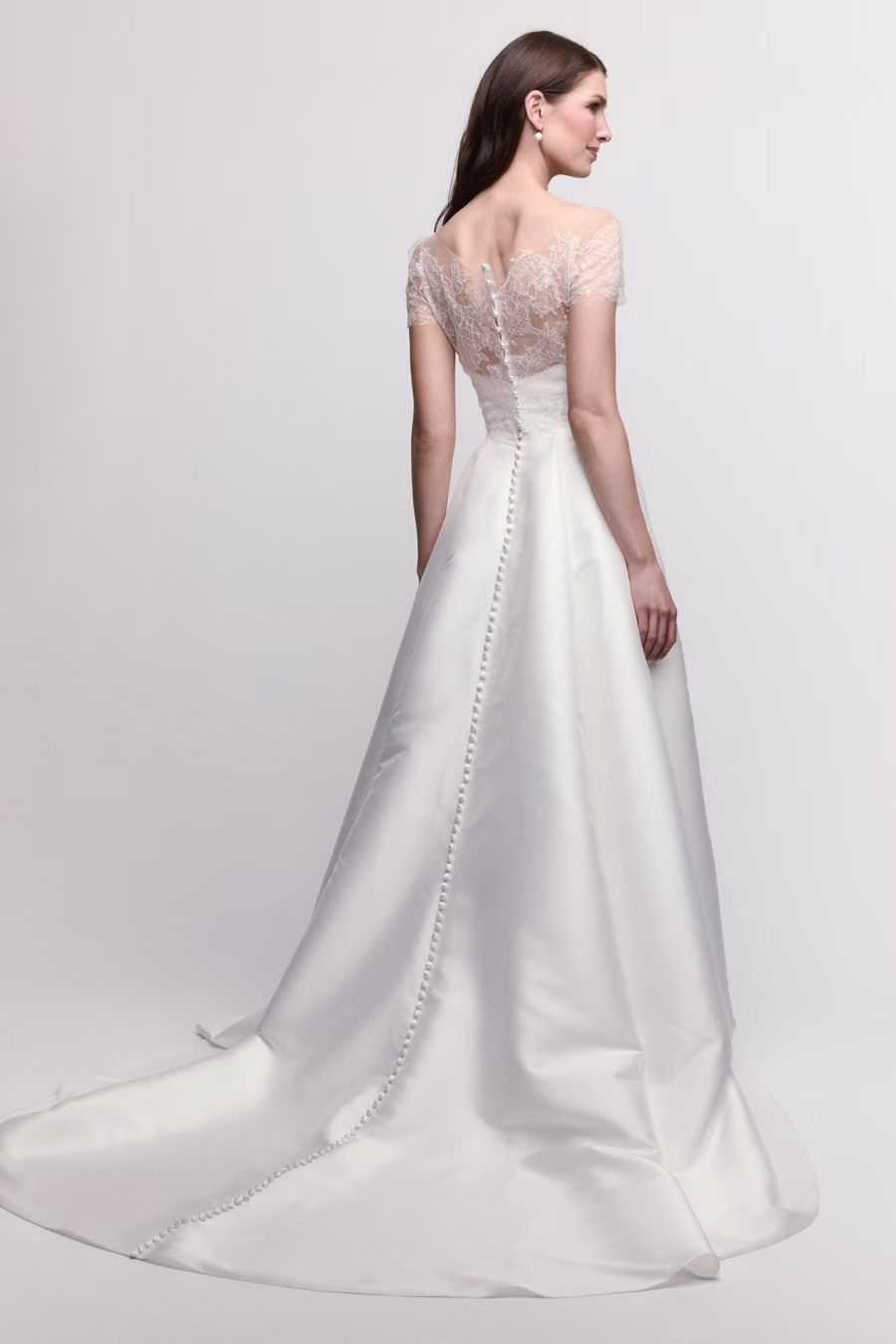 Alpinia is a modern ball gown with a timeless point of view. Crafted in luminous Mikado, the silhouette feels structured yet effortless, creating a strong shape that moves beautifully. A classic sweetheart neckline and a trail of buttons down the back add refined polish that feels elevated but never expected. Paired with the Alpinia Lace Topper, the look softens instantly. Barely-there lace drapes across the chest and pearl buttons bringing a quiet layer of romance.