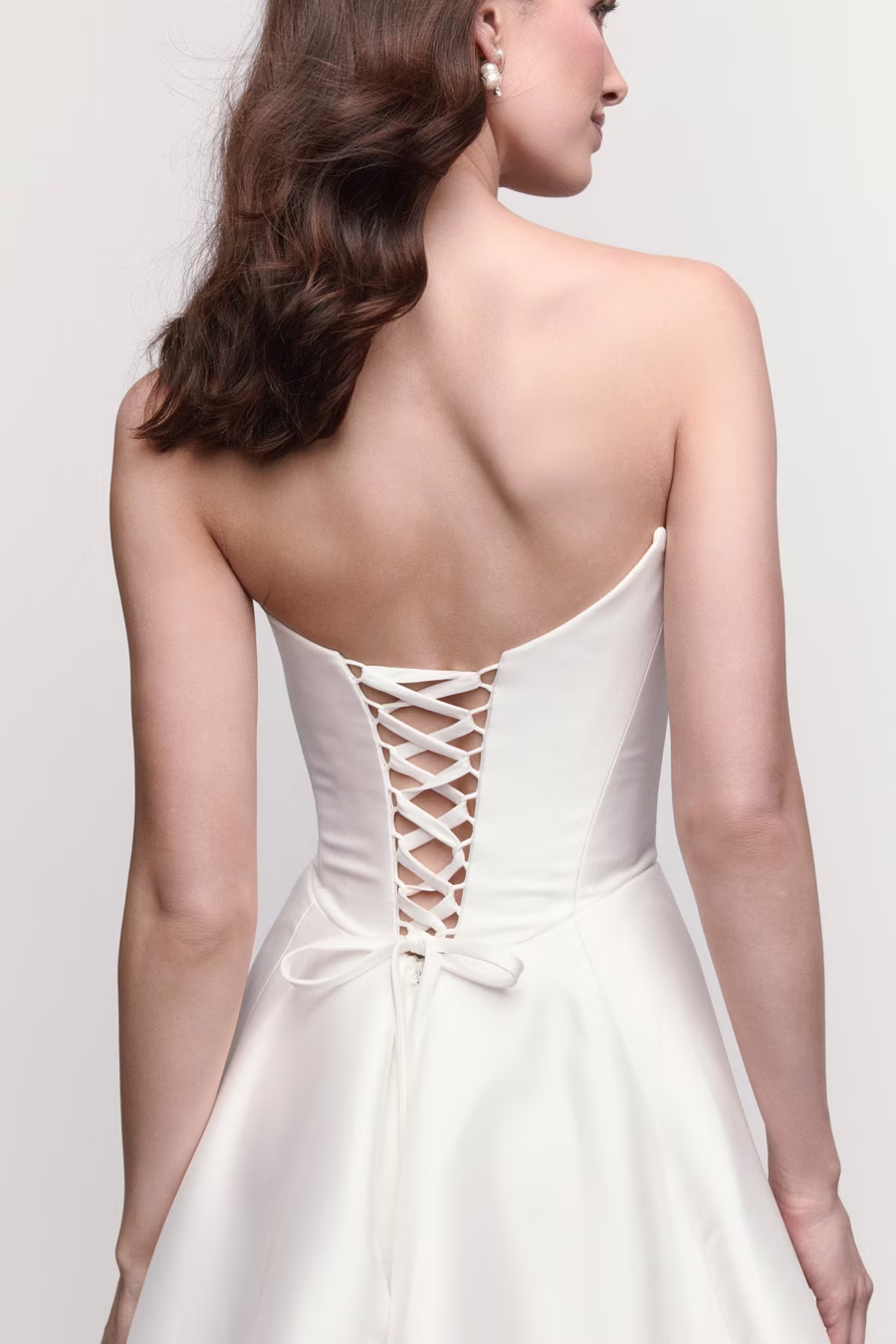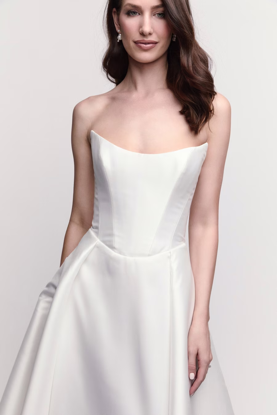 Nectarine offers a striking silhouetted in a crisp Mikado. The sculpted A-line shape is anchored by a modern scoop neckline that extends wide into the arms for a bold, fashion-forward look. A drop waist and chapel train add quiet drama, making this gown feel timeless, chic, and incredibly refined.