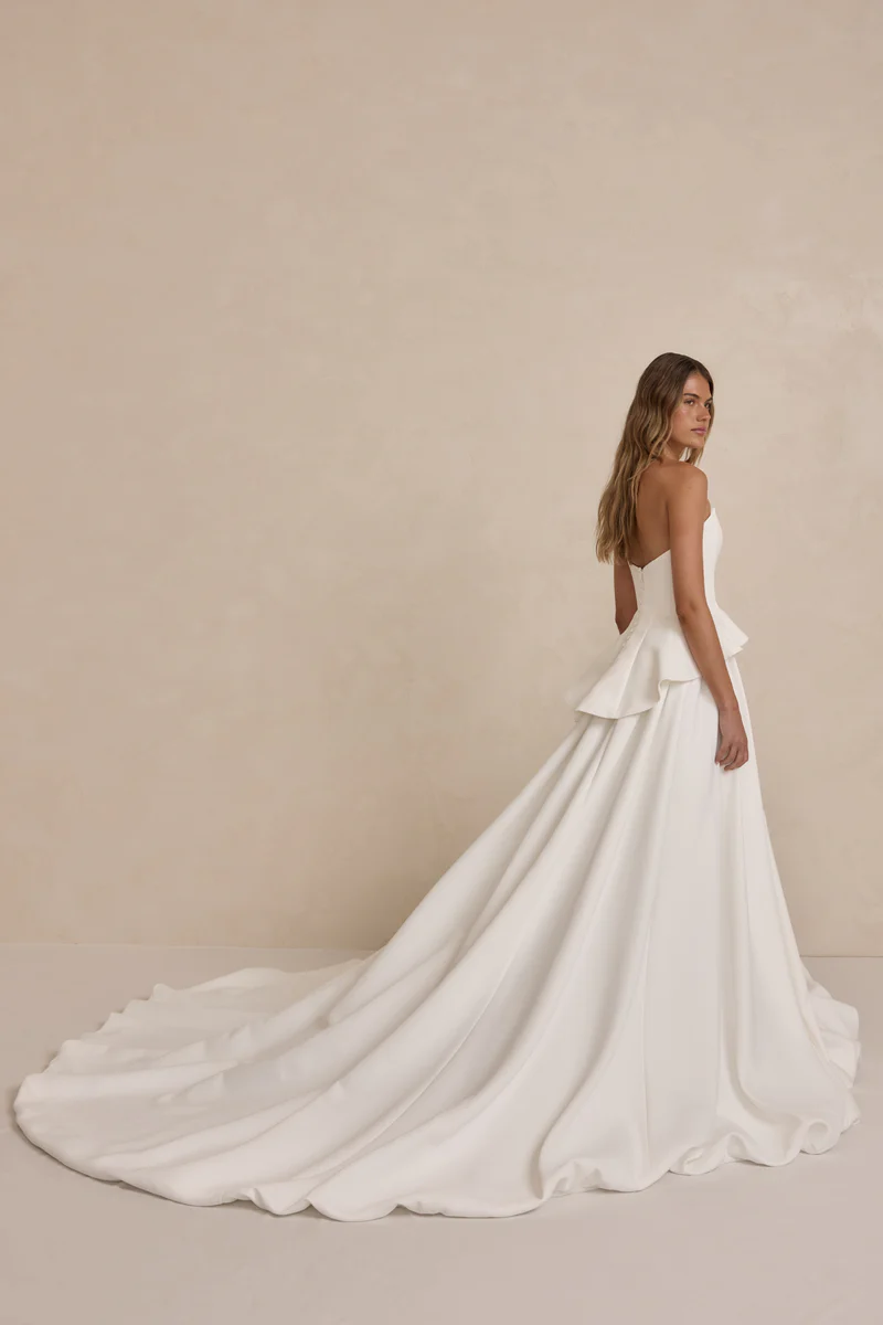 The Tanner combines modern femininity with thoughtful structure. The bodice features a flattering peplum silhouette, designed to enhance the waist and create a soft, romantic shape. For added versatility, the bodice is available as a detachable piece or can be ordered fully attached for a seamless look.