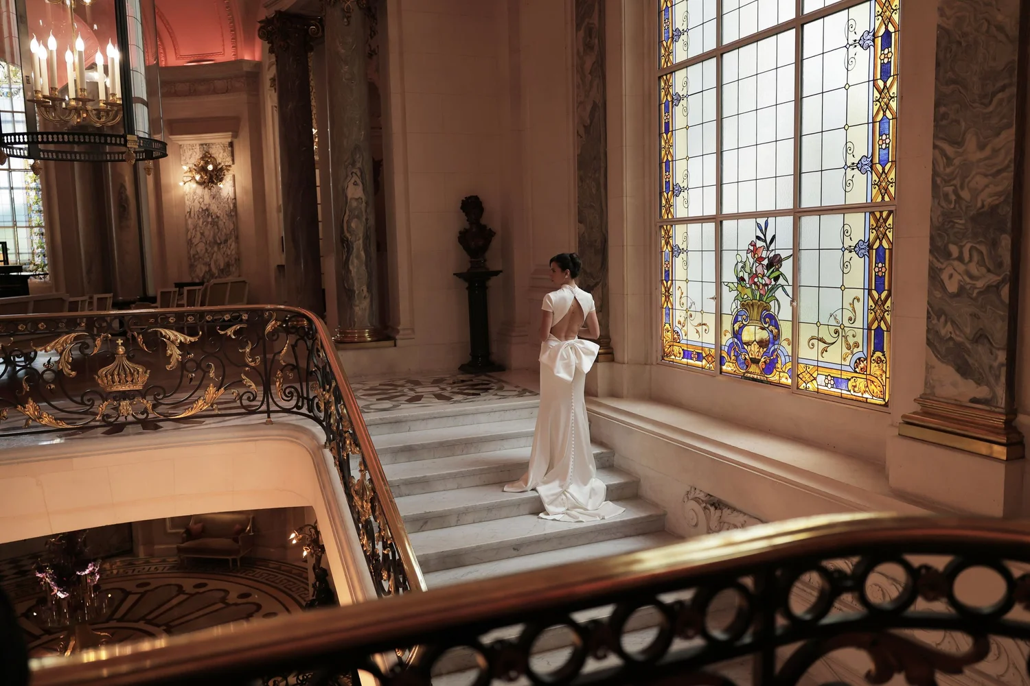 Celeste is the definition of clean, classic, and effortlessly refined. Impeccably tailored, Celeste features a high neckline and delicate cap sleeves for the sleekest fit throughout the bodice. Crafted in luminous satin crepe, the skirt is softly ruched to flatter the figure, while a low open back adds a modern twist. For versatile styling, Celeste can be worn with a dainty, detachable bow at the nape of the neck for a subtle finish, or with an optional statement bow at the back waist for added drama.