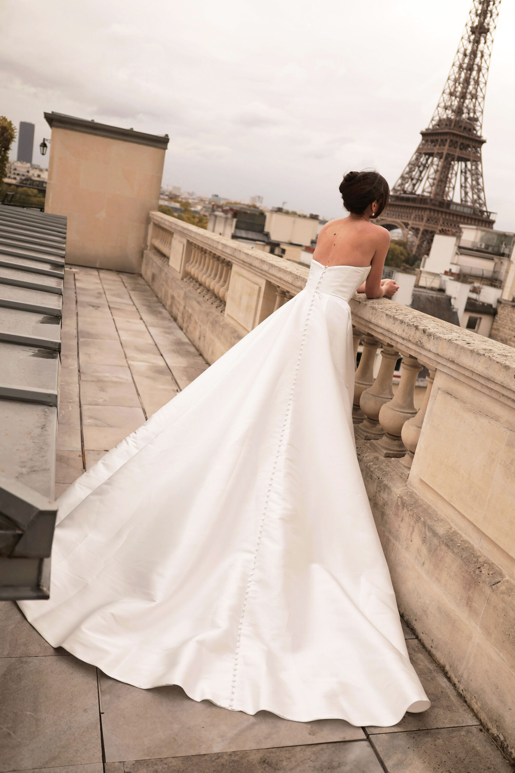 Crafted in our signature Mikado, Haven features a soft scoop neckline framed by delicate Chantilly lace that drapes over the bust. The modern basque waist, defined by angled seams, sculpts and flatters the silhouette before flowing into a clean A-line skirt with a split. Finished with fabric buttons that trail to the end of the train, Haven is the perfect gown for the bride who cherishes the finer things in life.