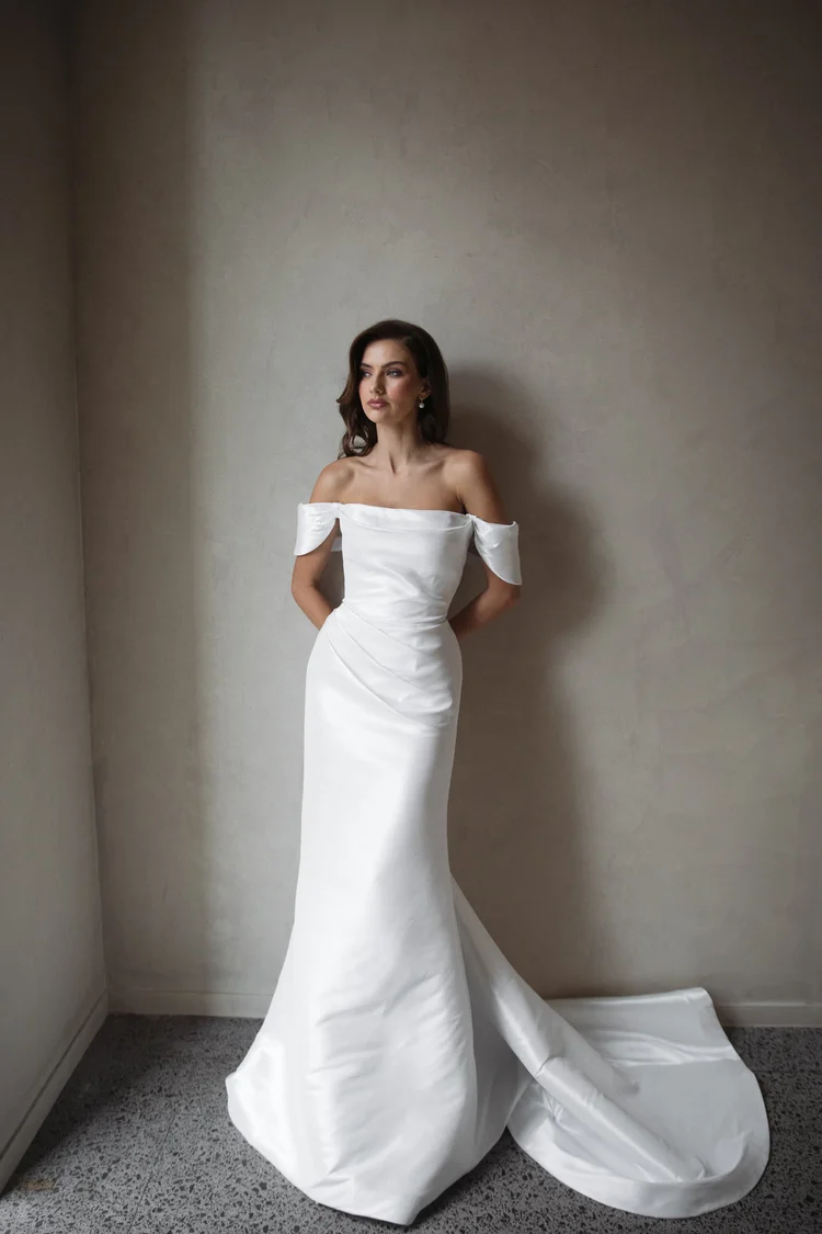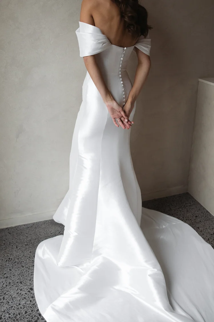 Mia is crafted from high shine mikado, offering a luminous finish with beautiful structure. The fitted skirt features fabric covered buttons along the back zip, adding delicate detail while highlighting your silhouette. The softly draped bodice flows effortlessly into detachable, bow shaped draped sleeves, offering versatile styling options.