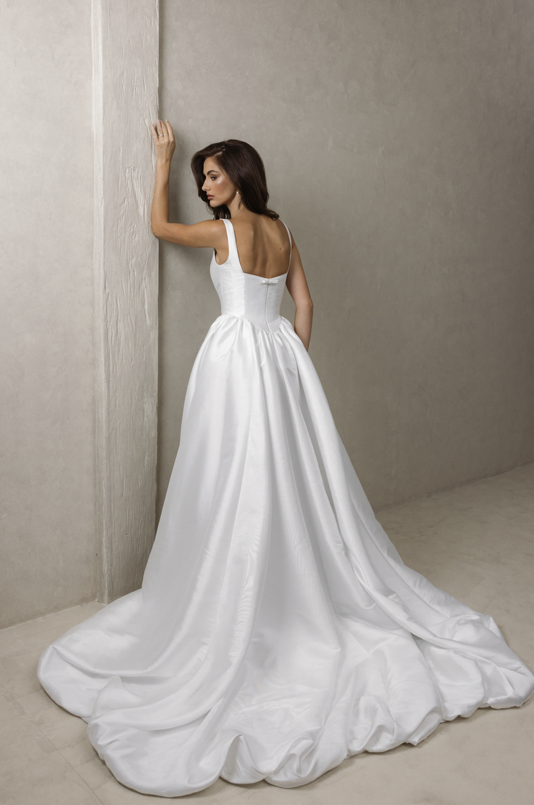 Crafted from our signature mikado, Natalia features a flattering square neckline and back with a low basque waist that beautifully elongates the figure. A delicate bow detail tops the back zipper, adding just the right touch of detail. The A-line skirt finishes with a bubble hem, creating soft fullness and graceful movement.