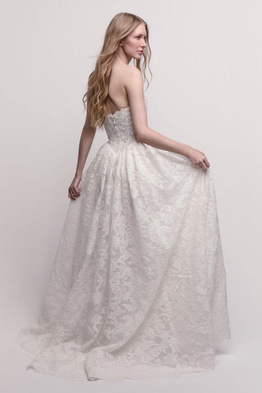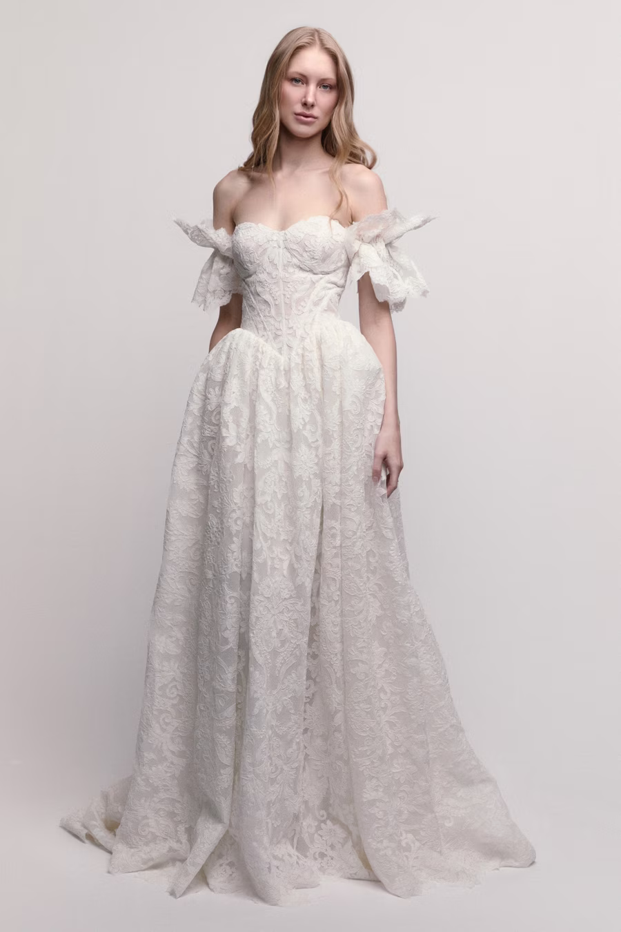 Feels like stepping into an old-world painting with modern edges. Suzette pairs a traditional sweetheart neckline with a sculpted drop Basque waist and a full A-line skirt, all cut in bold Rothenburg Lace mixed with dotted and Haze Net for layered texture. The lace is corded for depth and richness, giving the gown character without heaviness. Delicate sleeves add a touch of romance that feels curated and intentional.