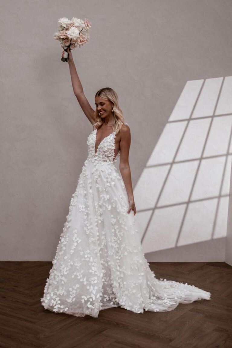 Spring has sprung! Wedding venues are in full bloom and stunning garden weddings are plentiful. Floral wedding dresses are absolute perfection for a spring wedding, whether you like a classic romantic look or opt for a more modern boho vibe–so many possibilities! Also, spring wedding gowns allow a bride to choose from most any fabric, as the weather can still be cool at the start, or warm toward the end of the season. So, you