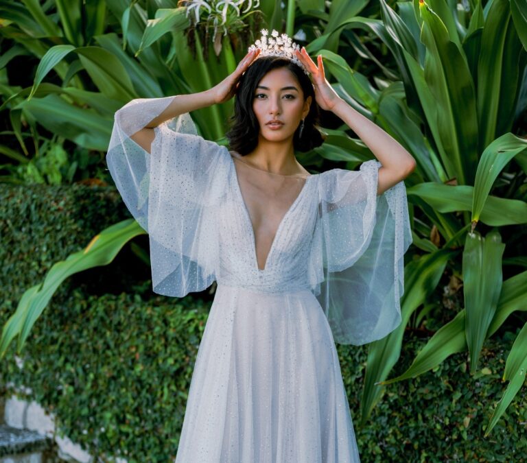 Boho brides have a look all their own–elegant, natural, and otherworldy. When it comes to the gowns, you will see lots of flowing fabrics, floral prints, vintage-inspired lace and all that is whimsical. Boho wedding dresses are inspired by many things, including vintage vibes and the beauty of nature itself. So, how have designers made this look even more eye-catching? By adding sparkle, of course! Now you can shimmer and shine in your boho gown