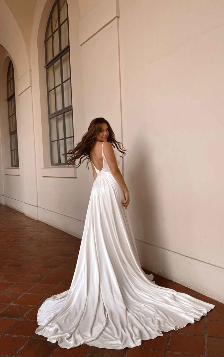 Silk wedding gowns are a classic. They are absolute showstoppers with their sleek and chic feel, and perfect for the bride looking to exude effortless elegance on her big day. Silk is the very definition of “stunning simplicity!” Silk is also more versatile than you may think. It can be used as an all-over fabric or as statement details like oversized appliques. This timeless fabric can be found in all wedding dress styles and silhouettes–ballgowns,