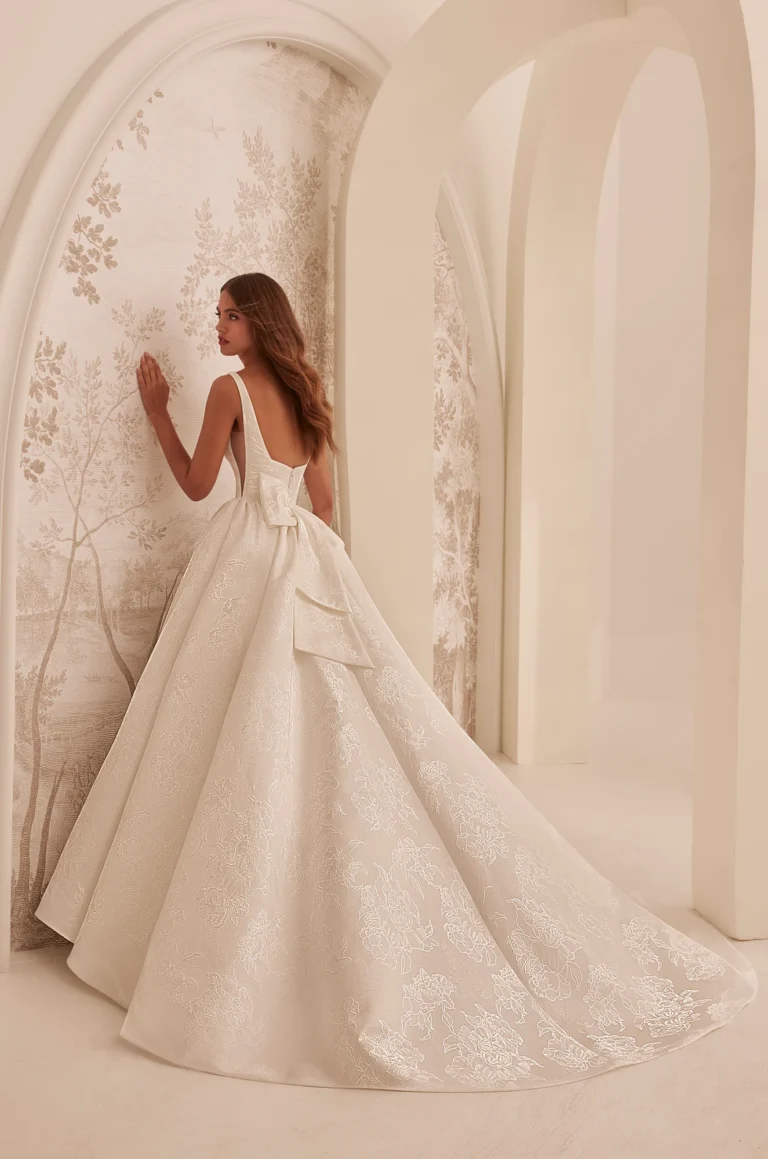 Textured fabrics, often called brocade, are rising in popularity for many reasons.They are known for their intricate patterns on rich fabrics, such as Mikado, satin and more. A raised pattern on the fabric adds instant visual interest and a classic, elegant touch. The pattern can come in the form of lovely florals or of abstract lace, depending on the designer and your taste. Best of all, brocade is available in all wedding dress silhouettes! The